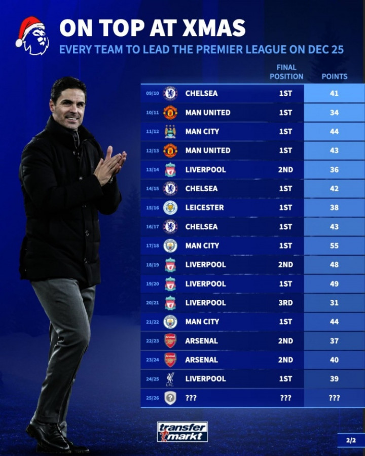 直播吧12月19日讯《转会市场》列出了近年英超圣诞榜首球队的积分及最终排名,近7年仅2队最终夺冠。