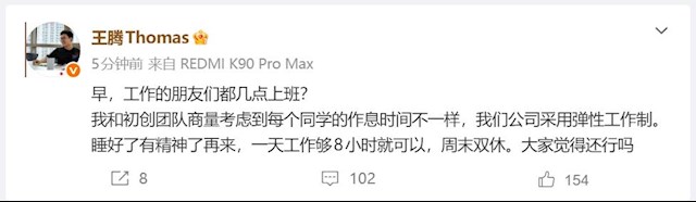 快科技1月12日消息,前REDMI总经理王腾发微博表示,我和初创团队商量考虑到每个同学的作息时间不一样,我们公司采用弹性工作制,睡好了有精神了再来,一天工作够8小时就可以西安高新配资,周末双休。